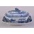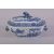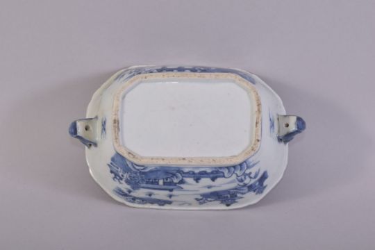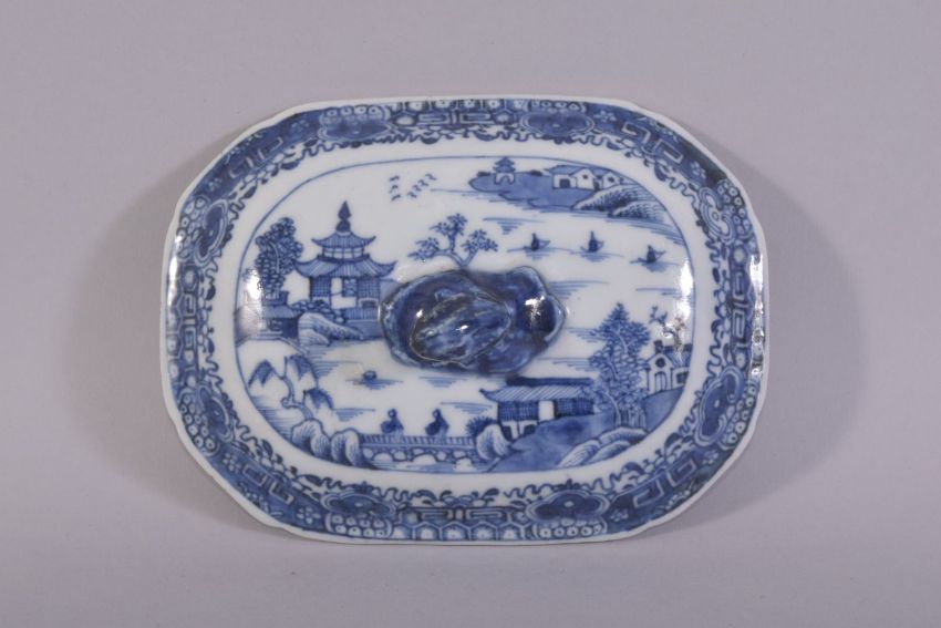 A SMALL CHINESE BLUE AND WHITE PORCELAIN TUREEN AND TRAY, decorated with landscape scenes all over depicting buildings, figures and boats, with zoomorphic handles, dish 19cm x 13cm, tureen 18cm long.