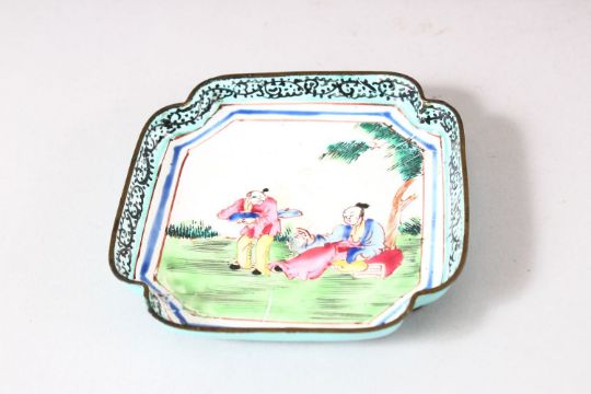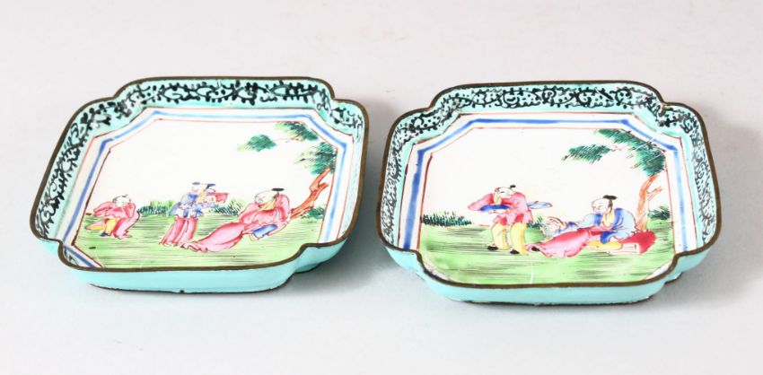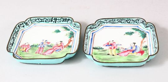 A PAIR OF CHINESE CANTON ENAMELLED DISHES, painted with figures in a landscape, 9.5cm square.