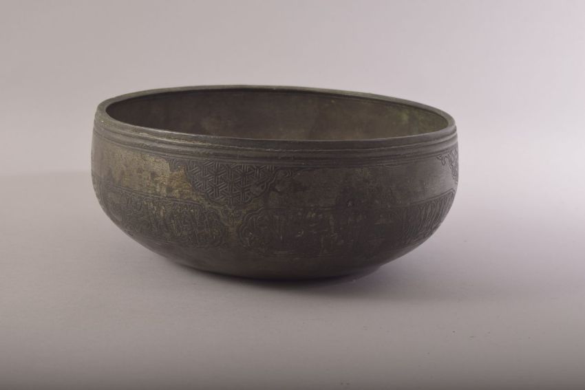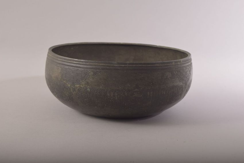 AN ISLAMIC MAMLUK ENGRAVED BRONZE BOWL, engraved with panels of calligraphy, 22.5cm diameter.