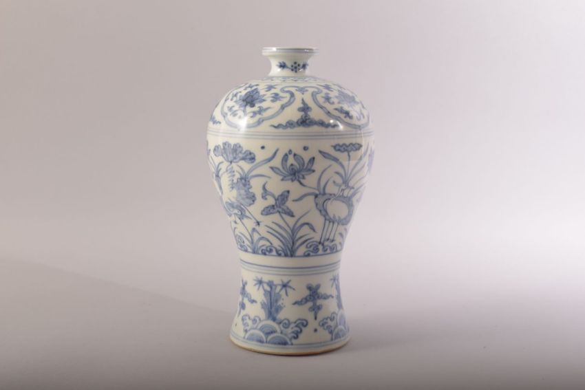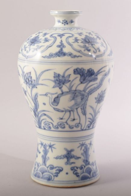 A CHINESE BLUE AND WHITE MING STYLE MEIPING VASE, decorated with cranes, flowers and stylised waves, 25cm high.
