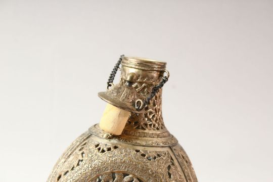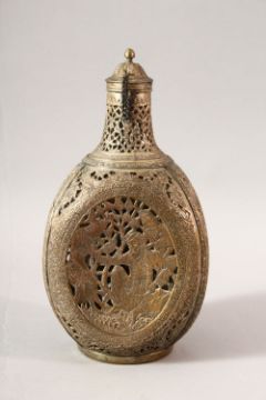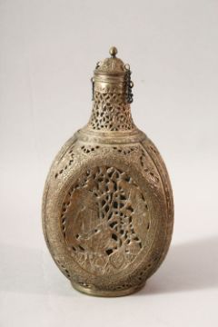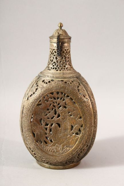 A PERSIAN OPENWORK LIDDED DECANTER, with carved panels of figures 25cm