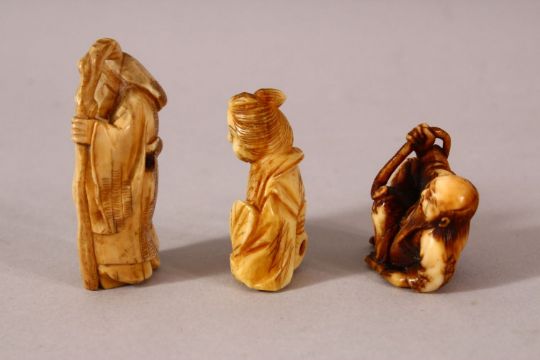 THREE JAPANESE MEIJI PERIOD CARVED IVORY NETSUKE - one depicting a lucky god holding his staff, 5cm together with another two carved netsuke