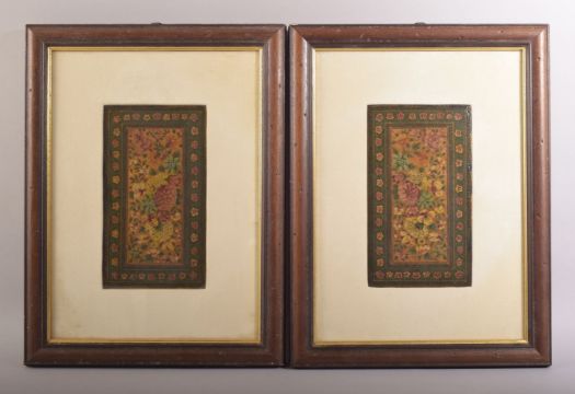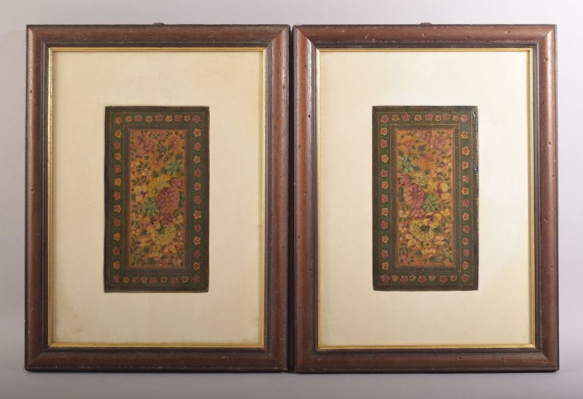 AN EARLY PAIR OF PERSIAN PANELS / COVERS - possibly for a mirror or Quran, painted with flowers, framed and glazed, both panels approx. 20cm 11cm, framed 37cm x 28.5cm.