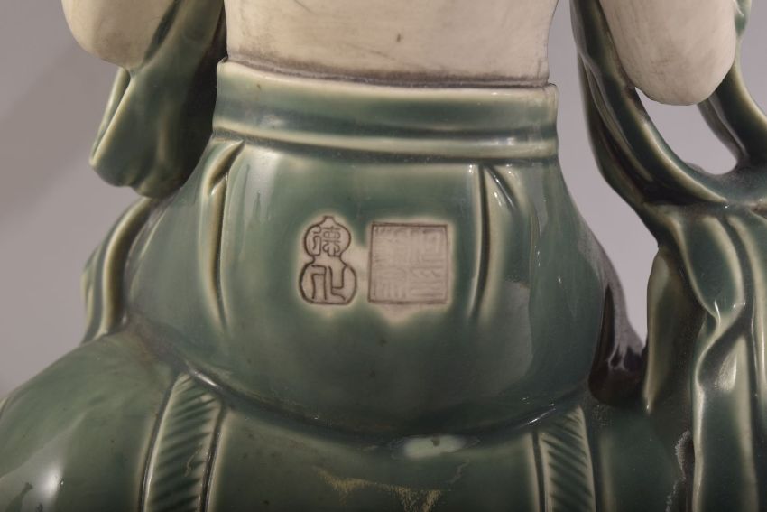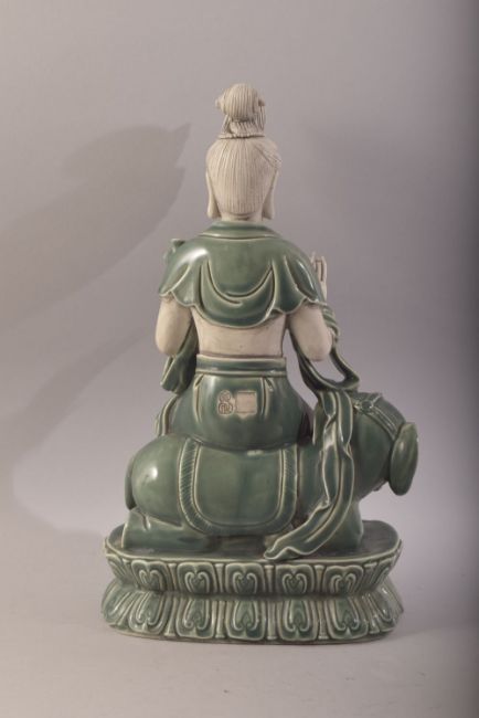 A CHINESE DEHUA PORCELAIN FIGURE OF GUANYIN & ELEPHANT - the goddess seated upon the back of an elephant with a green glaze - the verso with twin impressed stamps - 37cm high