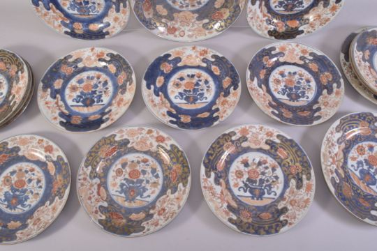 A LOT OF EIGHTEEN JAPANESE IMARI WARE PORCELAIN, each piece decorated in the typical imari red, blue and gilt design, comprising of sixteen plates, a larger dish and a soup dish, (af), various sizes (18).