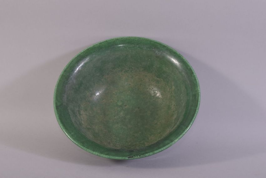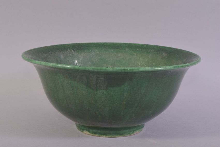 A GOOD LARGE CHINESE GREEN CRACKLE GLAZED BOWL, 26cm diameter.