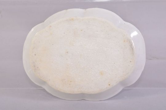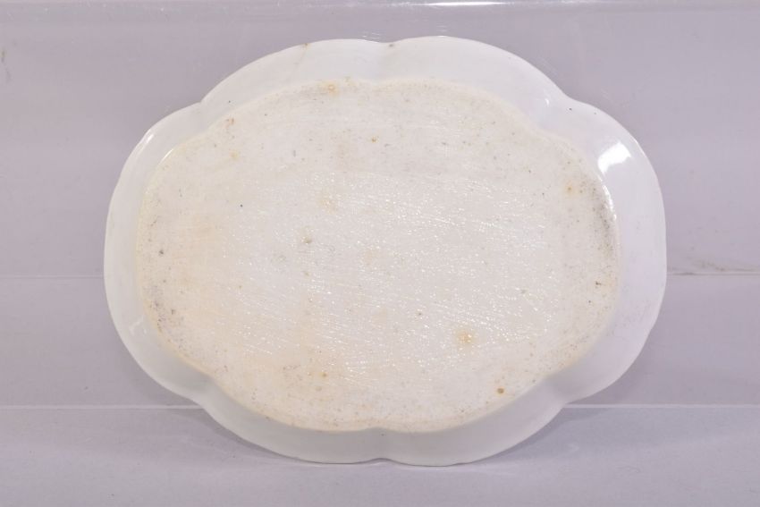 A SMALL CHINESE BLUE AND WHITE PORCELAIN TRAY, painted with a landscape including trees, figure and boats, 12cm x 9cm.