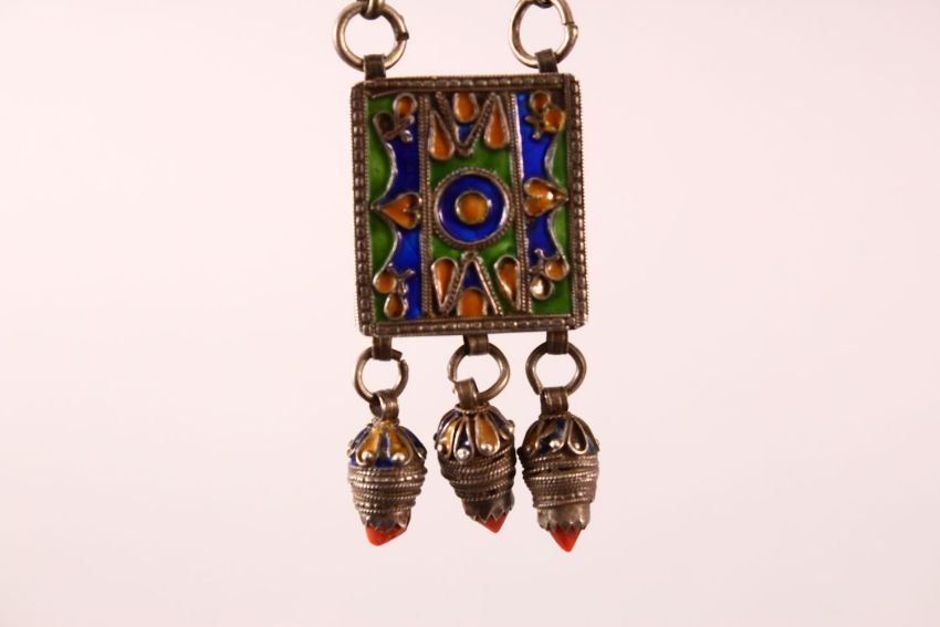 A 19TH CENTURY MOROCCAN ENAMEL & SILVER NECKLACE - the pendant with enamel decoration 34cm