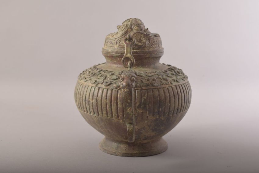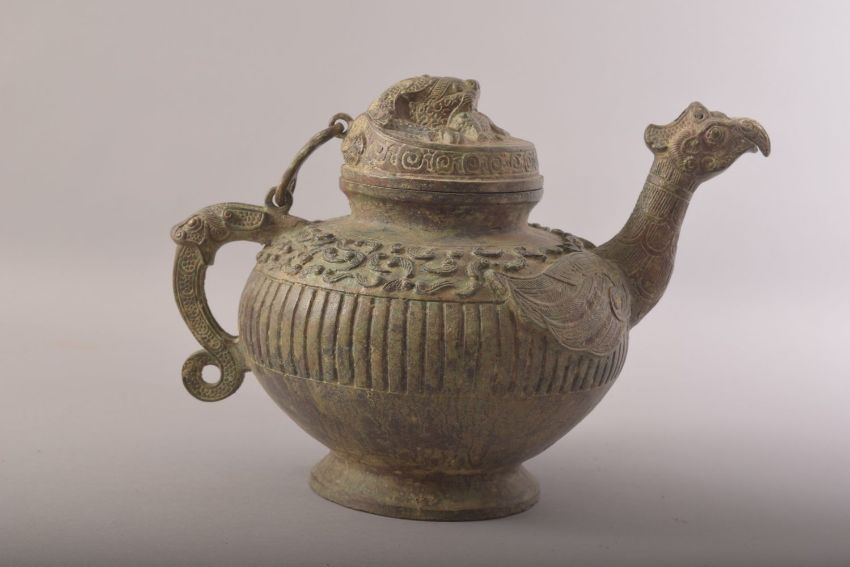 A CHINESE BRONZE ARCHAIC STYLE TEAPOT, with zoomorphic handle, spot and finial, 20cm high.