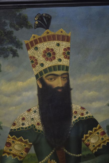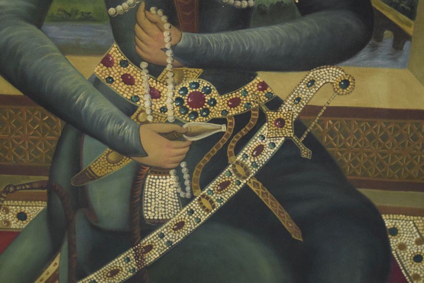 A LARGE FINE PAINTED PORTRAIT OF FATH ALI SHA, painted in oils, depicting the king of persia kneeling upon a carpet holding a huqqa pipe in one hand and a string of beads in the other hand with a landscape beyond, calligraphy to the top left of the painting, framed, unglazed, 128cm high x 88cm wide.