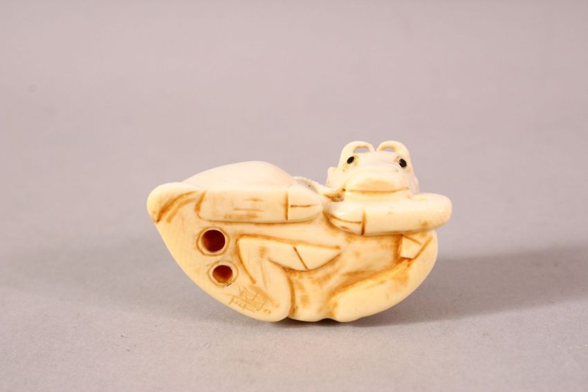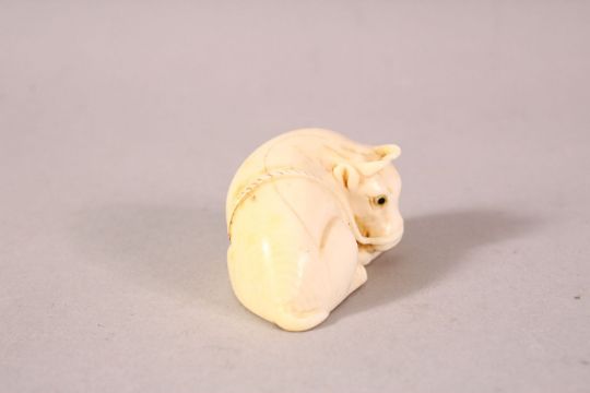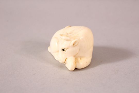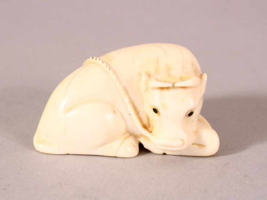 A JAPANESE MEIJI PERIOD CARVED IVORY NETSUKE OF A RECUMBENT OXEN - the oxen recumbent - the underside signed " Tamaishi" 5cm