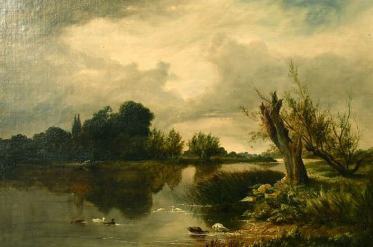 Attributed to Sydney Richard Percy (1821-1886) British, a river landscape with ducks in the foreground, oil on canvas, 11" x 16".