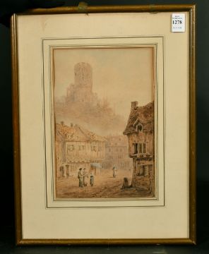 Early 19th Century English School, A continental town scene with figures in a market square, watercolour, 10" x 7".