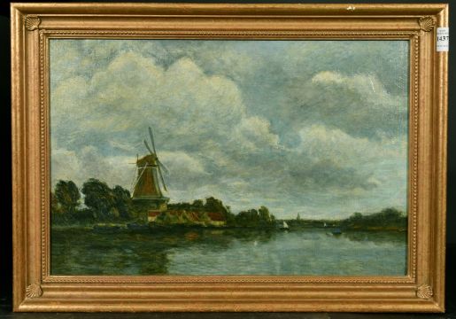 Modern British School, A river landscape with a windmill and boats on the water, oil on board, 13" x 19.5".