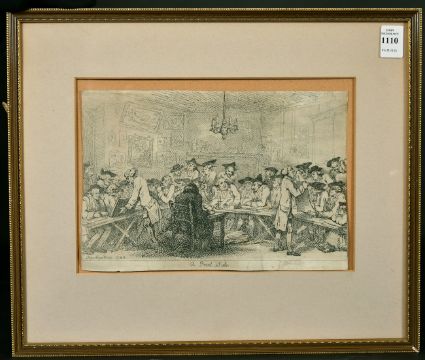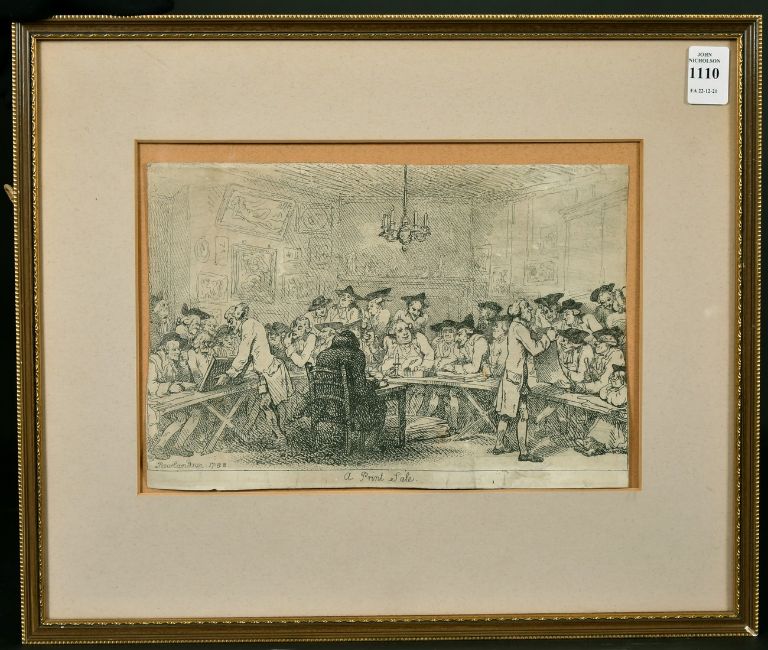 Thomas Rowlandson (1757-1827) British, etching of 'A Print sale', dated 1788, trade label verso, 7" x 10.25". Provenance: Folio Fine Art Ltd, (a/f).