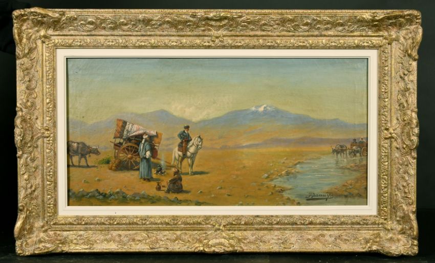 Manner of Zommer, travelling tradesmen resting by a river, oil on canvas, bears signature, 12" x 24".