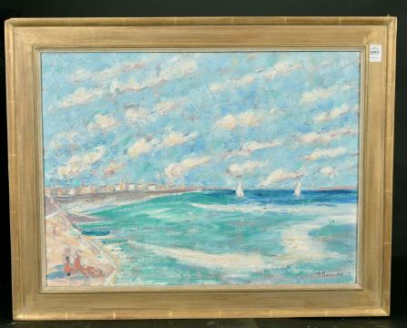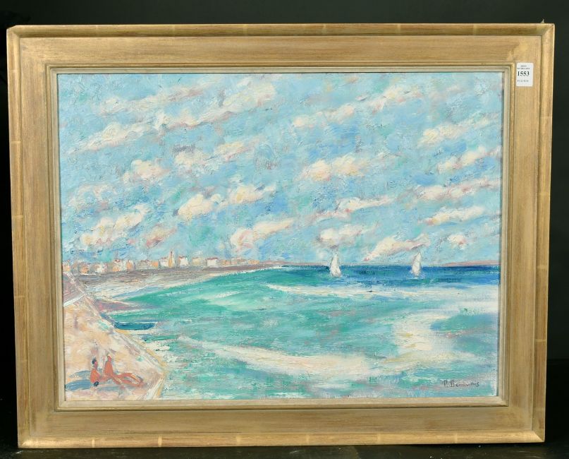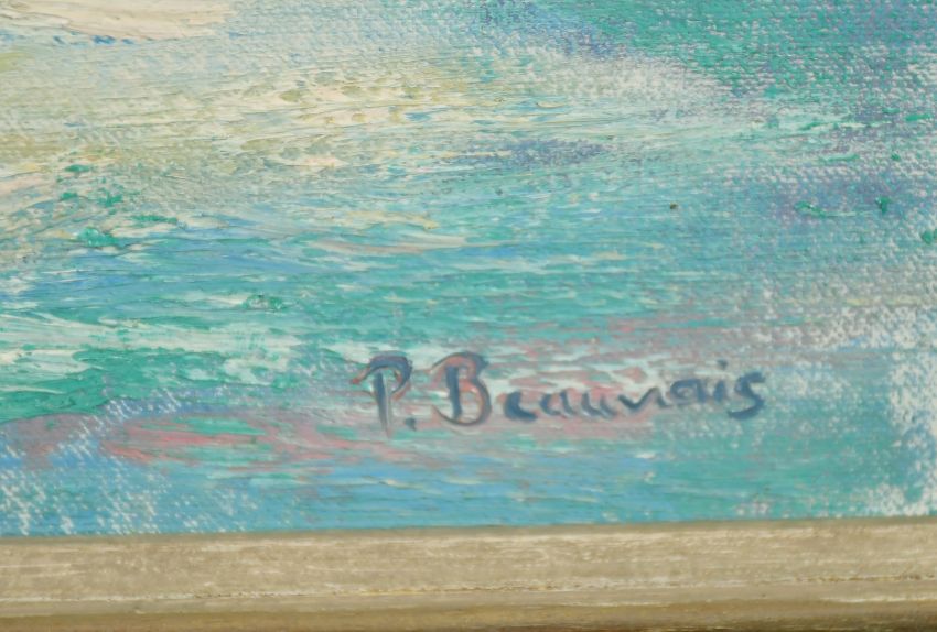 Paul Beauvais, figures on a beach with sailboats in the distance, oil on board, signed, 18" x 24".