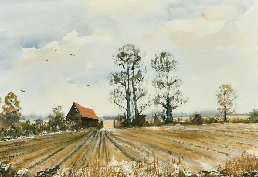 Circle of Rowland Hilder (1905-1993) British, A view across a ploughed field towards a barn and a line of trees, watercolour,12" x 18.25".
