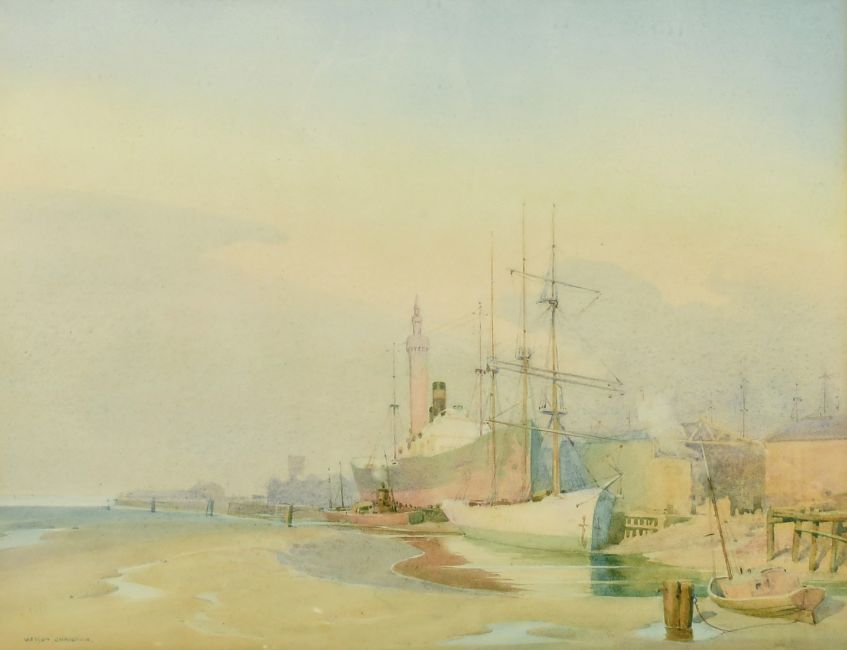 Watson Charlton (b.1887-?), 'Shipping in a dock with a minaret beyond', watercolour, signed, 15.25" x 20.25".