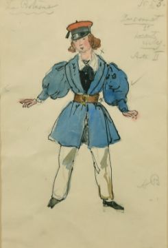 Alexandre Benois (1870-1960) Russian, a costume design for La Boheme, a young man in a blue coat and hat, watercolour and pencil, signed with initials and annotated, 9.25" x 6".