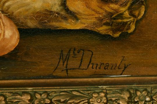 Duranty, French School 19th Century, A still life study of mixed objects on a tabletop, oil on canvas, signed, 13" x 18".