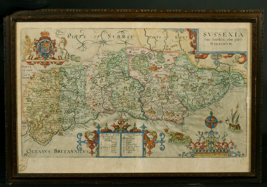 John Norden and William Kip, a hand-coloured map of Sussexia, 17th Century, hand colouring probably later, 10.25" x 16".