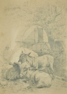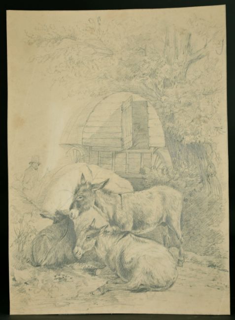 Circle of George Morland, Donkeys by a gypsy caravan, 16" x 11.5", along with two other unrelated drawings, (unframed). (3).