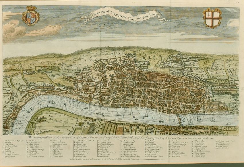 A View of London about the year 1560, by William Maitland, hand coloured engraving, 18th Century, 12.5" x 19".