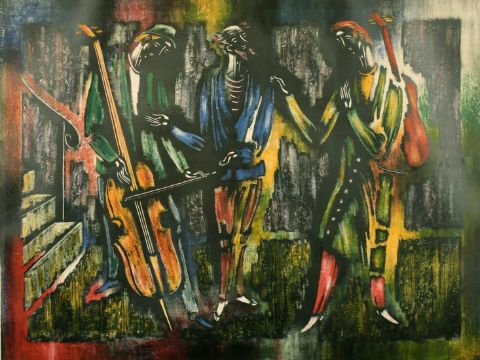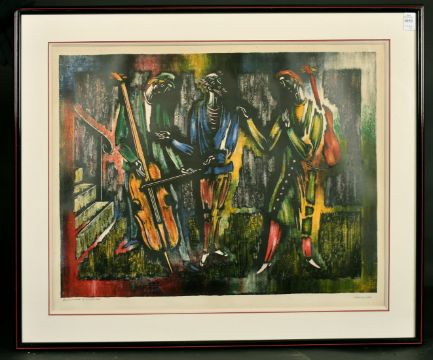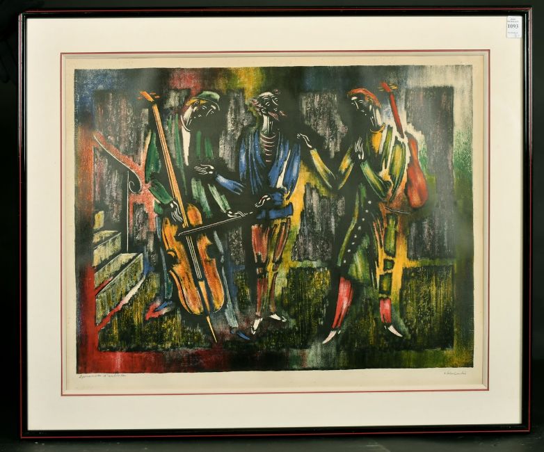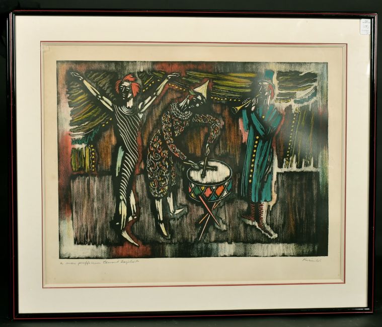 A pair of 20th Century French School lithographs of figures playing instruments, artist's proof, indistinctly signed and dedicated in pencil, 18" x 24", (2).
