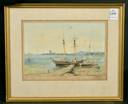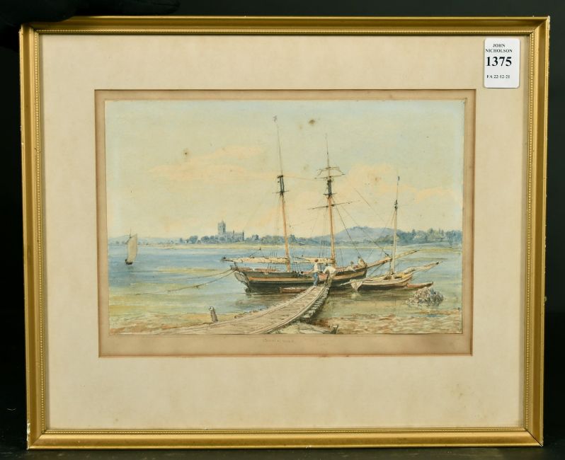 Admiral Sir Charles Burrard (1793-1870) British, 'Christ Church', a scene of boats being loaded at the shoreline, watercolour, inscribed to front and on label verso, 6.25" x 9.25".