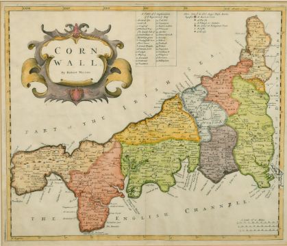 Cornwall, by Robert Morden, hand coloured engraving, 18th Century, 14.75" x 17".