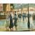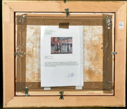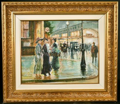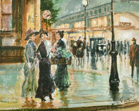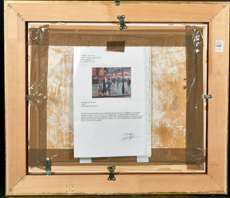 Giuseppe de Sanctis (1858-1924) Italian, A scene of female figures conversing on a busy street corner, oil on panel, signed, 14" x 16.5".