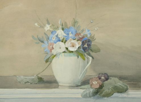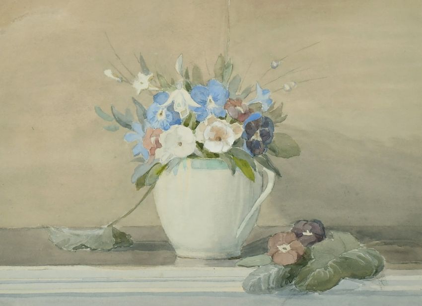 Circle of Kate Cameron (20th Century) A still life of spring flowers in a green and white jug, watercolour, 10" x 13.5".
