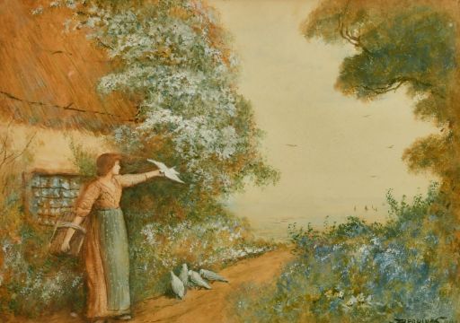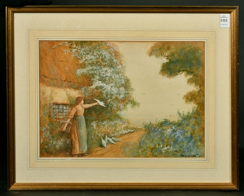 Fred Hines (act. 1875-1928), A lady feeding doves, watercolour, 10.5" x 15".
