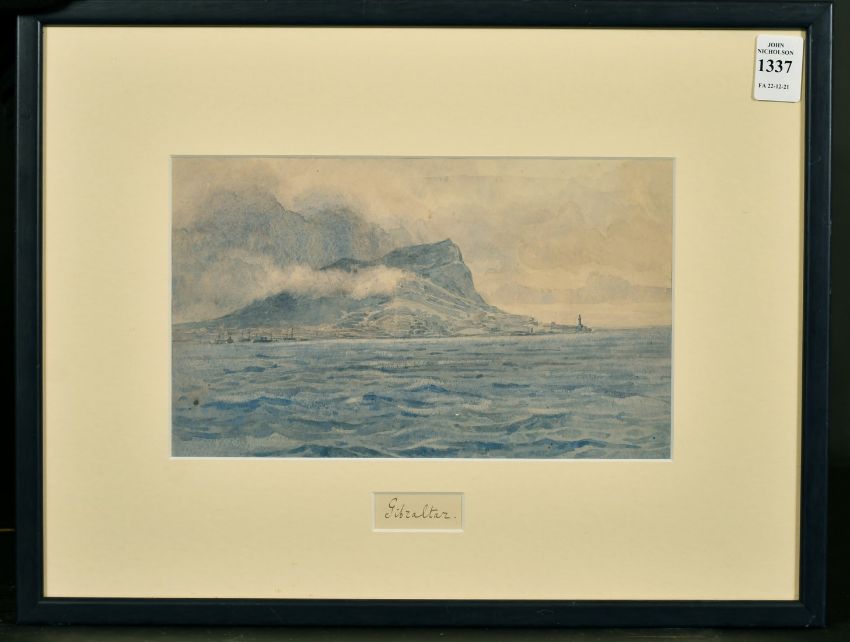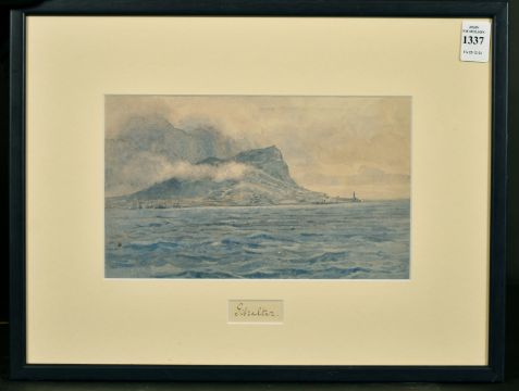 Circle of Norman Wilkinson (1878-1971) British, The Rock of Gibraltar viewed from the sea, watercolour, 5.5" x 9.25".