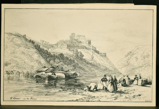 A group of 4 drawings, Houses by a bridge on the river, 'Glanmire Bridge near Cork', with inscription, 6.25" x 7.25", along with a view of a castle by the river, signed James Janson, 6" x 9" and two others, 'St Goar on the Rhine', inscribed and initialed, 6.25" x 10.5", and a lady by steps to a house, inscribed, 'Berncastle on the Moselle', 10" x 6.75", (unframed) (4).
