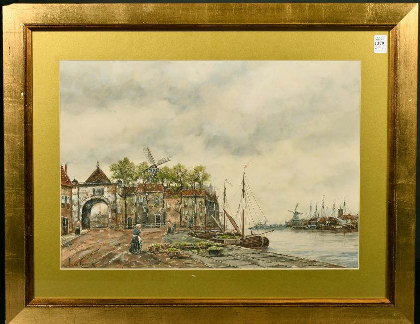Jan Van Couver (1864-1910) Dutch, A Dutch port scene with a figure loading produce onto a boat with windmills and ships beyond, watercolour, signed, 14.25" x 20.75".