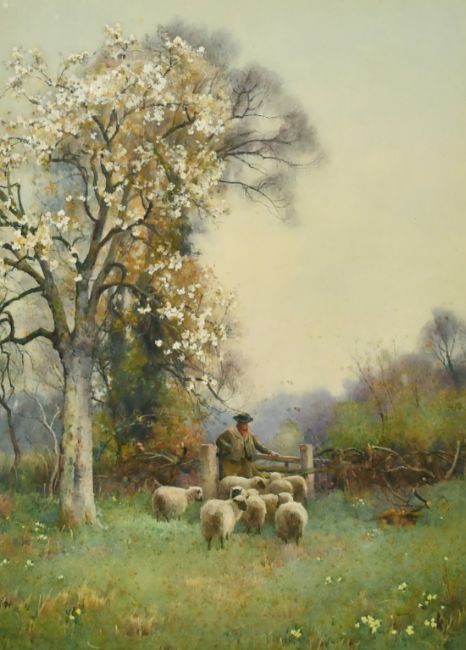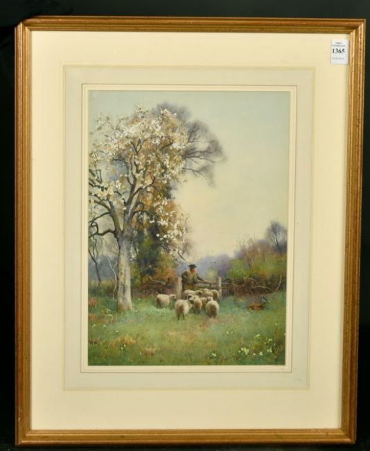 Benjamin Sigmund (1857-1947) British, A Shepherd and his flock beneath blossom, watercolour, signed, 14" x 10".