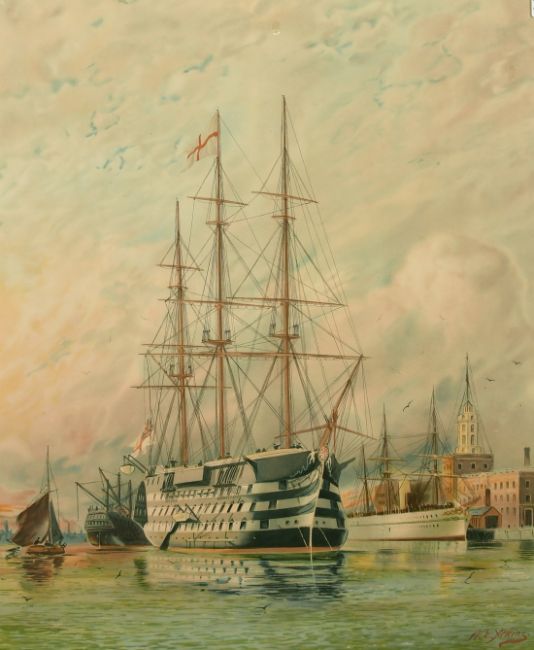 After William E Atkins, British 1842-1910- ''HMS Victory'', chromolithograph, published by J S Virtue & Co Lithographers London, 26" x 20", in a maple veneer frame.