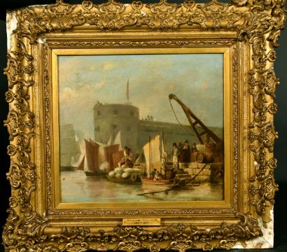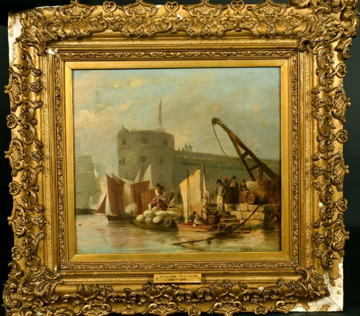 Attributed to William Anderson (1757-1837), Figures unloading a barge, canvas laid down on oak panel, bears label verso, 9.5" x 10.5".