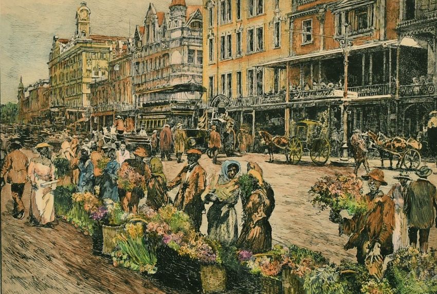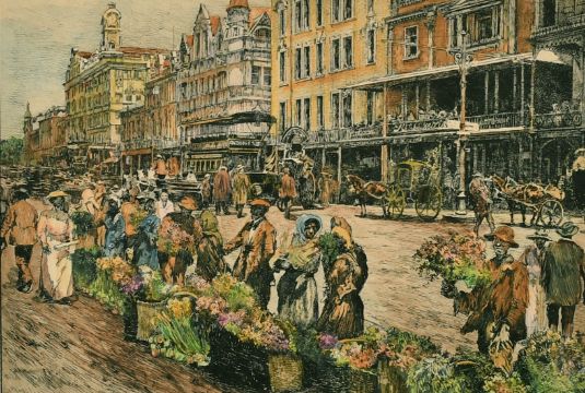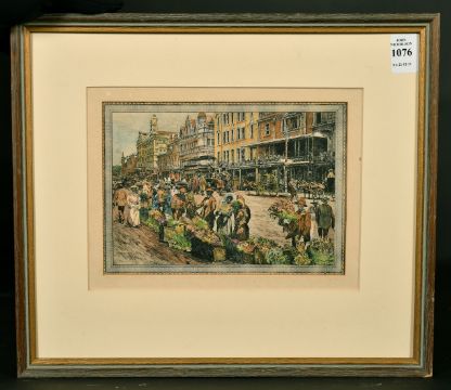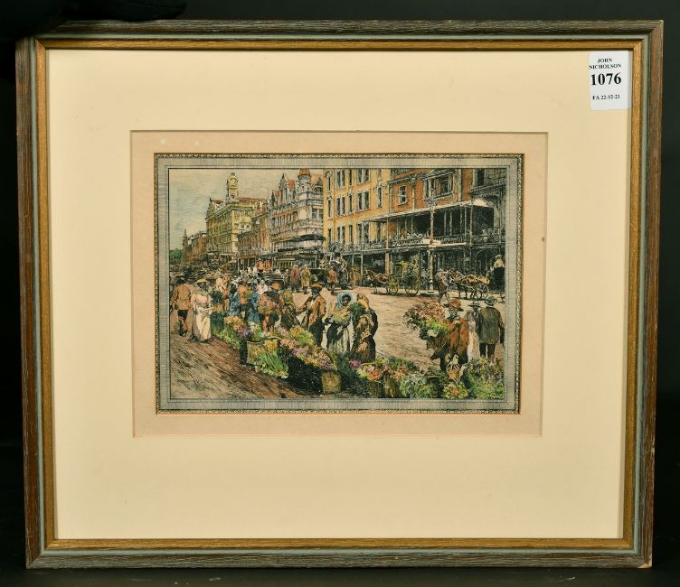 20th century South African School, Figures at a flower market (possibly Cape Town), coloured etching, 5.5" x 7.75".