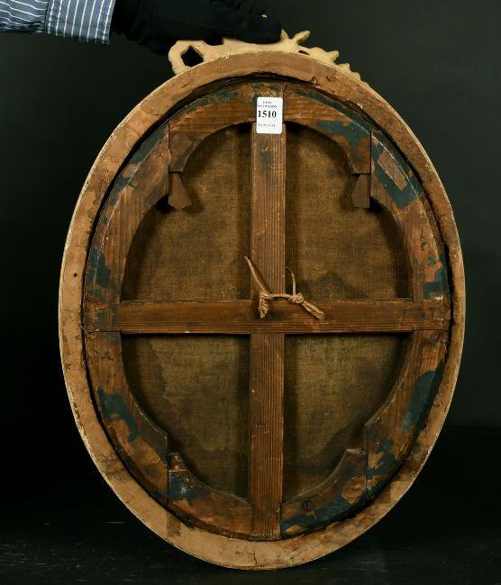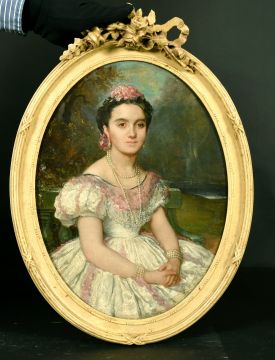 19th Century Continental School, A portrait of a seated lady in a parkland setting, oil on canvas, 16" x 13", oval.