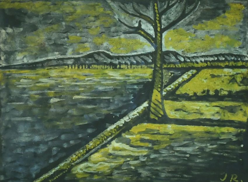 Jamini Roy (1887-1972) Indian, an early landscape of a tree near water, watercolour, signed with initials, 7.25" x 8.5".