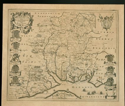 Johannes Blaeu, Hantonia sive Southantonensis comitatus vulgo Hant-shire, 17th Century, mounted, unframed, 16.5" x 20".