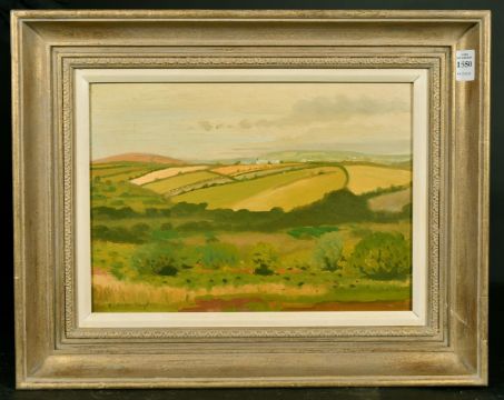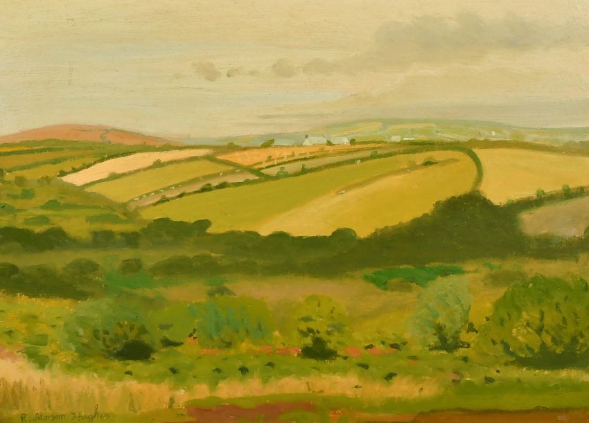 Robert Morson Hughes (1973-1953) British, a view across fields with cottages on a hilltop, oil on board, signed, 10" x 13.5".