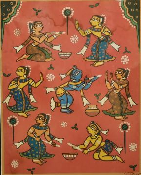 Jamini Roy (1887-1972) Indian, colourful female figures on a red background, watercolour, 14" x 11".
