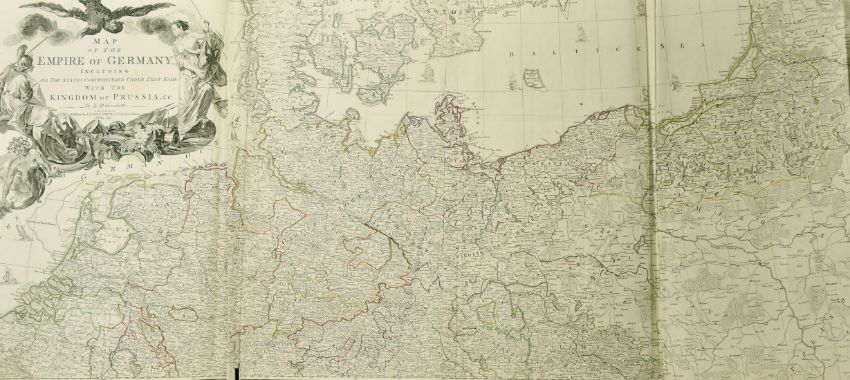 Map of the Empire of Germany, by Delarochette and published by Laurie and Whittle, an outline-coloured two-part wall map, each sheet 21" x 46", (unframed).