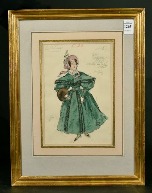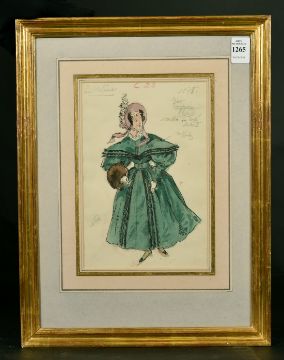 Alexandre Benois (1870-1960) Russian, a costume design for La Boheme, a lady with a fur hand muff, watercolour and pencil, signed with initials and annotated, 9" x 6".