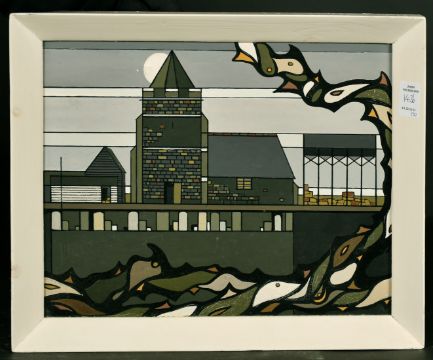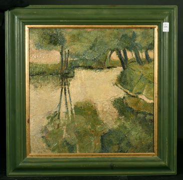 20th Century School, A tree lined river landscape, oil on board, 18" x 18", along with a scene of farm buildings and blossom, signed 'Sylva', 8" x 11", and an urban landscape 10.5" x 13.25", (3).