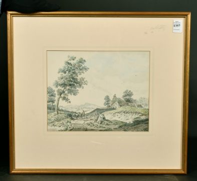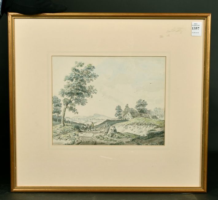 Manner of Paul Sandby (1731-1809) British, Figures and animals on a path with a town beyond, watercolour Ink and wash, 10" x 8".